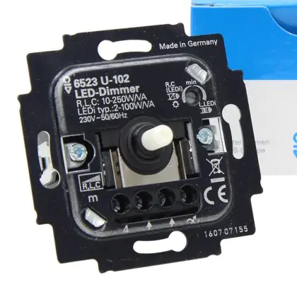 Der Busch-Jaeger 6523U-102 Rotary LED-Dimmer 6512-0-0334 verfügt über eine elektronische Sicherung. So ist garantiert, dass kein Kurzschluss entstehen kann und der Dimmer für LED-Lampen zudem überlastsicher ist.
