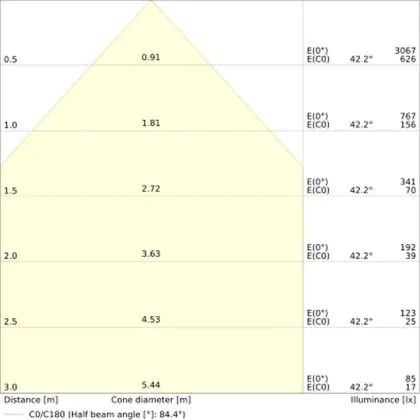 Beispiel: Wird eine Lampe mit einem Abstrahlwinkel von 60 Grad an der Decke (2,5 m Höhe) angebracht, erzeugt sie einen Lichtkegel von 2,9 Metern Durchmesser. Hat die Lampe hingegen einen Abstrahlwinkel von 120 Grad, beträgt der Lichtkegel 8,7 Meter im Durchmesser. |