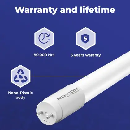 Die T8 LED-Röhre von Noxion kann nicht nur mit einer langen Lebensdauer von 50000 Stunden, sondern auch mit einer hohen Lumeneffizienz von lm/W überzeugen. Sie strahlt ihr Licht in der Farbtemperatur 3000K - Warmweiß aus und wird mit betrieben. Im Preis ist zudem eine All-In-Garantie von 5 Jahre Jahren enthalten.